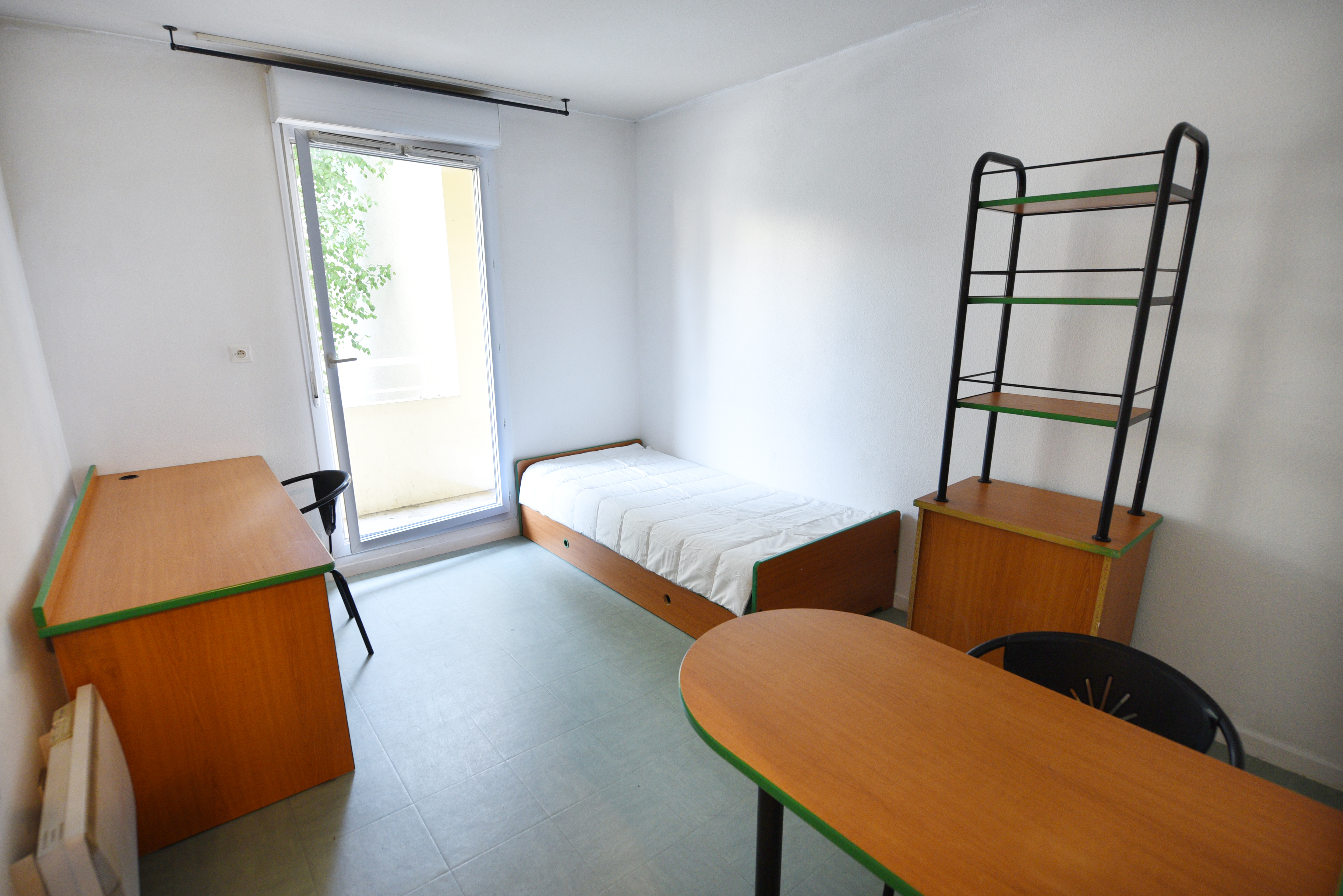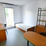 - D’une chambre avec un lit 1 pers, 1 bureau et des placards de rangement.