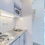 - D’une kitchenette avec des plaques électriques, un frigo, un four micro-ondes et des placards de rangement.